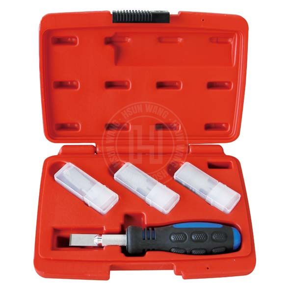 •Interchangeable Blades: This kit includes a variety ofinterchangeable blades, each designed for specific scrapingtasks. From paint removal to rust and gasket scraping, you'llfind the perfect blade for your needs.